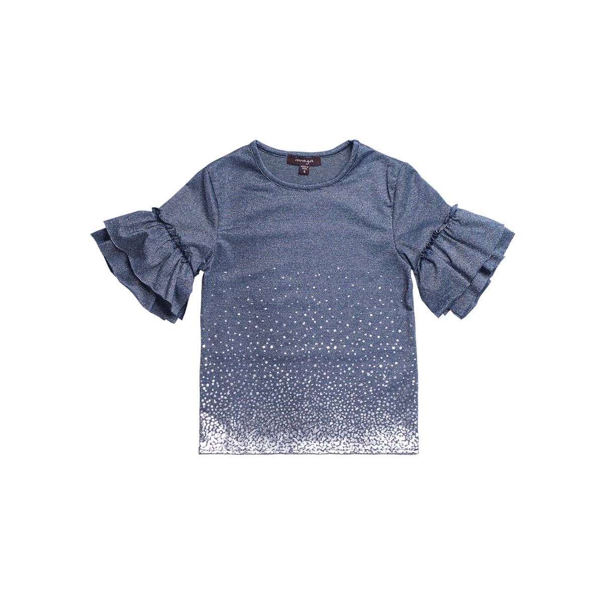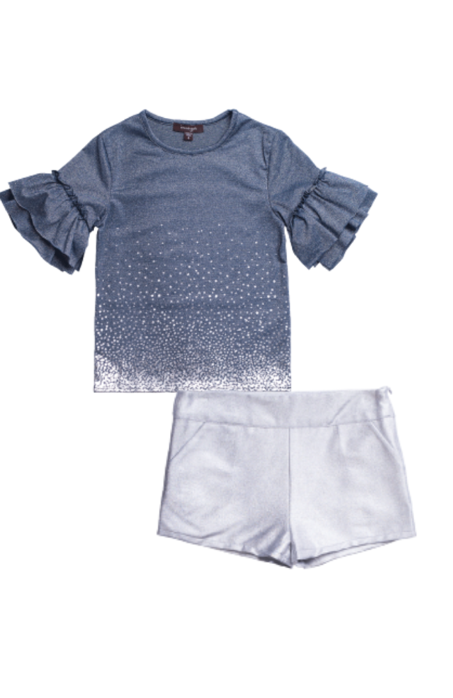 Metallic ombre printed tee with bell sleeves and silver metallic woven shorts.
