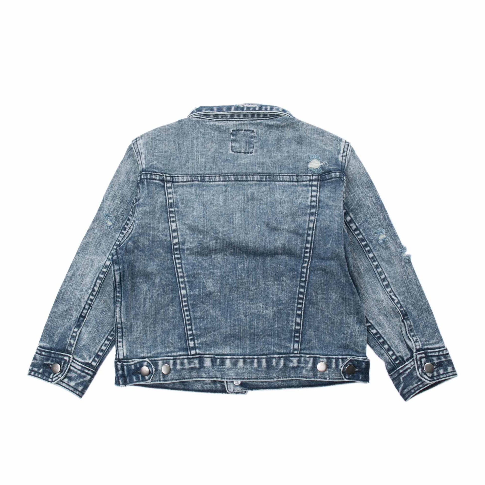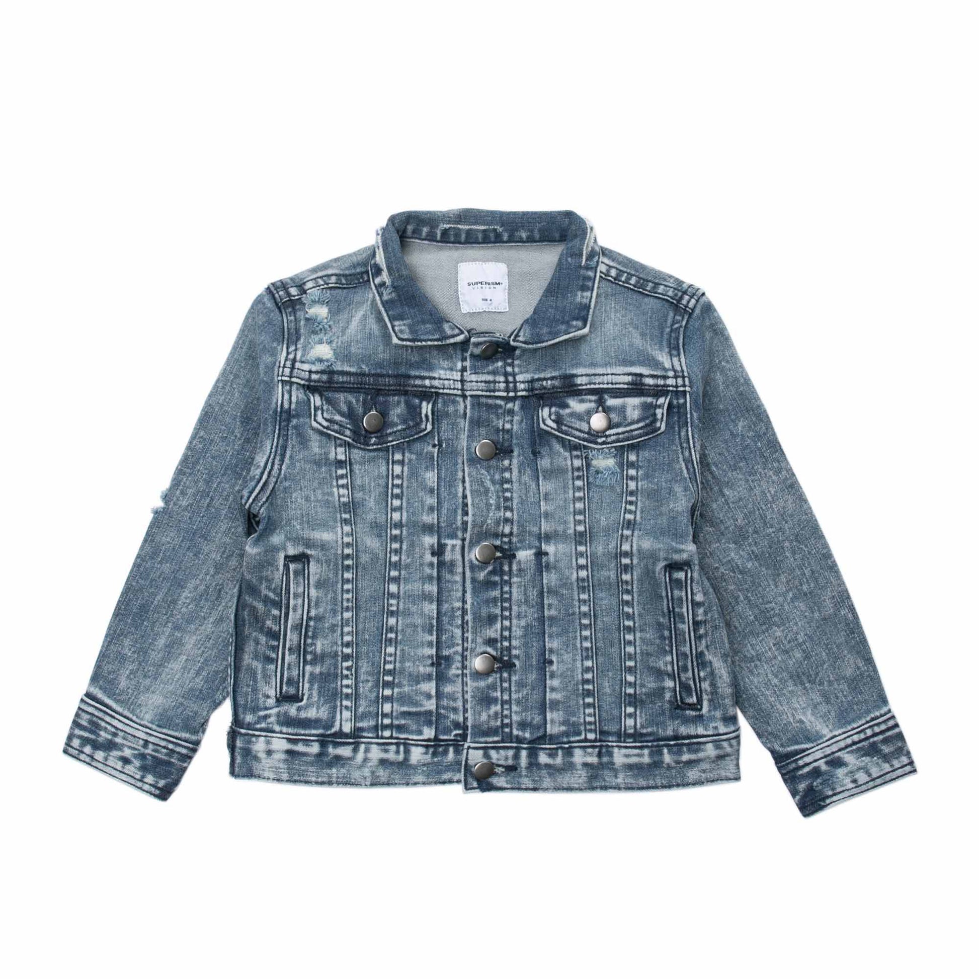 Stretch denim rider̥s jacket, snap button front closure, single welt front pockets, double chest flap pockets, rip and repair with wash snow, Superism shank buttons on sleeve cuffs.
