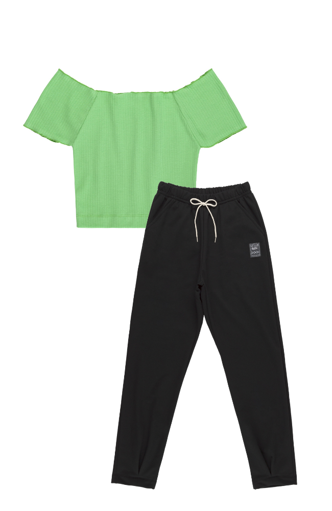 Green Off-Shoulder Crop Top & Black Sweatpants