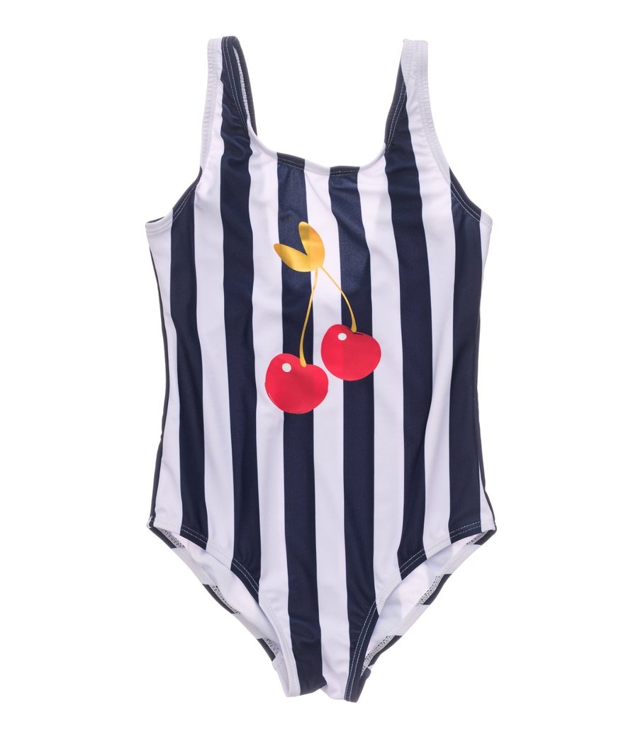 Feeling Cherry-tastic! Our Stripe Scoop Swimsuit is a fun addition to your Summer wardrobe. Featuring a bold Navy/White stripe, and a fun Cherry print with gold trim! This classic scoop swimsuit is flattering for any shape!
