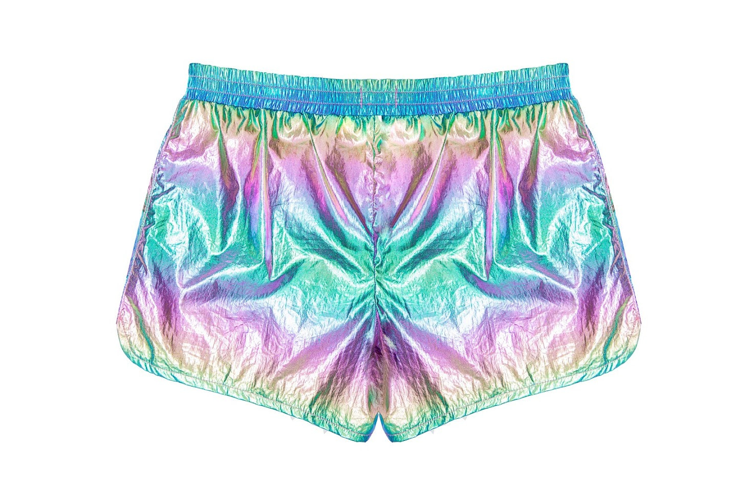 Sleeveless gold tank top paired with metallic rainbow shorts with heart details.