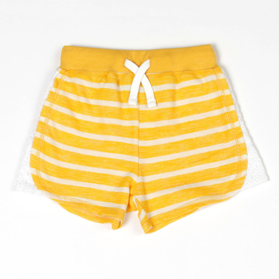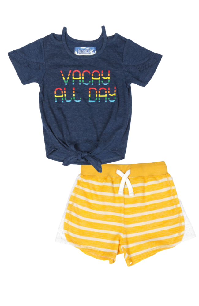 Vacay All Day tee in capri blue with cut out details at neckline and a tie knot detail with the eyelet yellow stripe shorts.